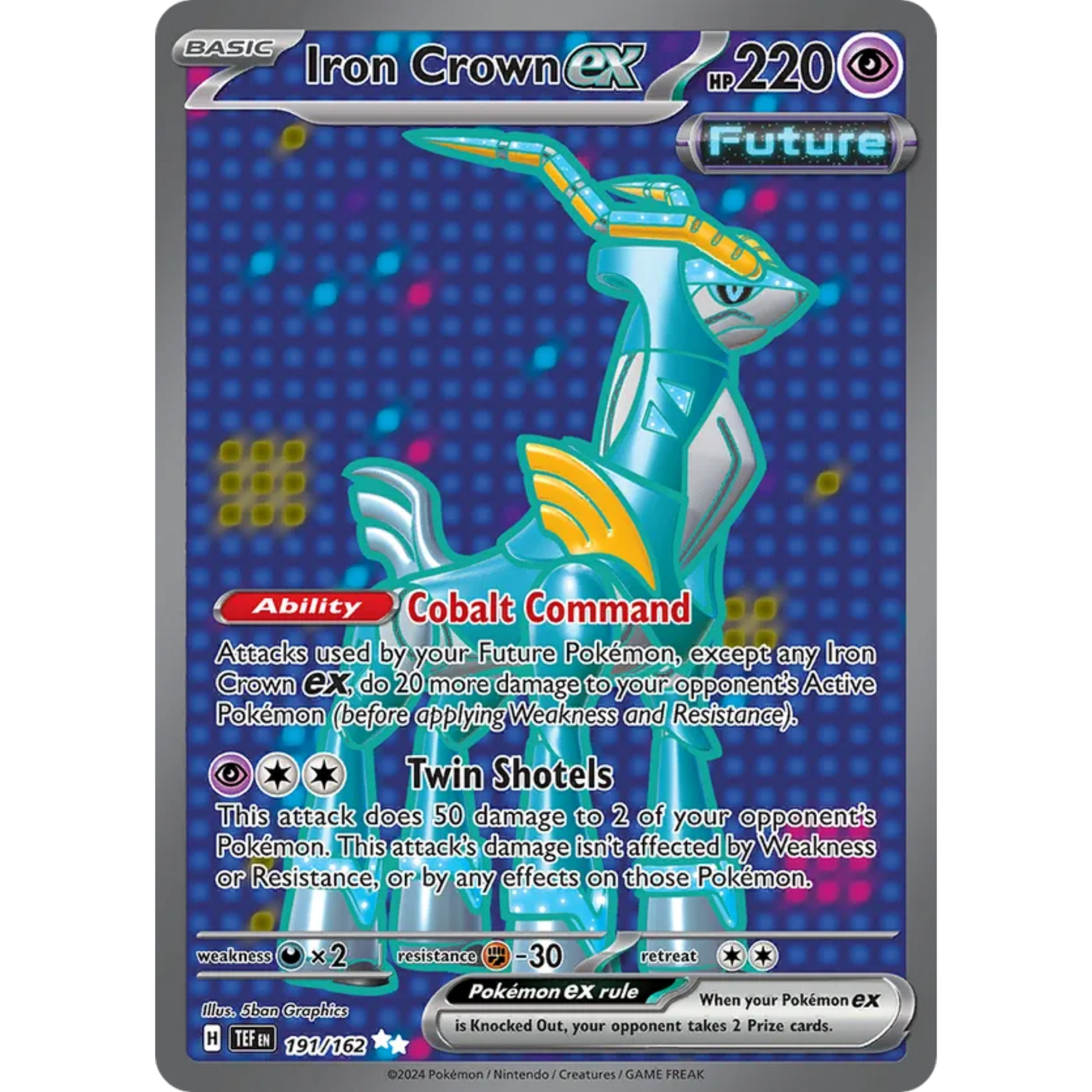 Ability: Cobalt Command - Your Future Pokémon’s attacks, except any Iron Crown EX, do 20 more damage to your opponent’s Active Pokémon (before applying Weakness and Resistance).