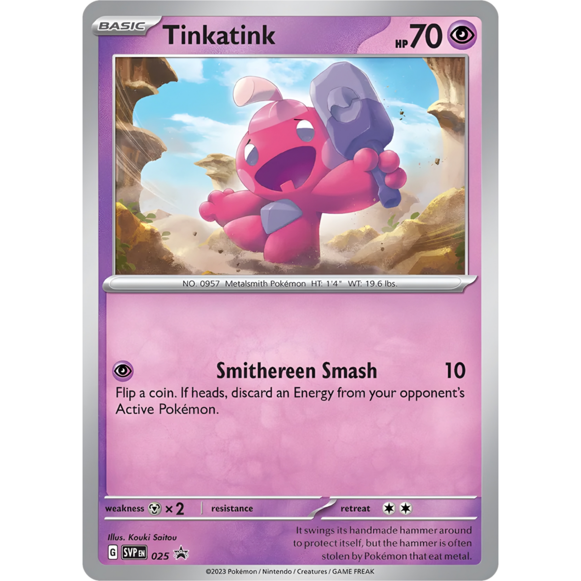 Ever wanted to smash through a cliff with a hammer? Well, now you can, sort of! With the Smithereen Smash attack, Tinkatink deals 10 damage and lets you flip a coin. If it lands on heads, say goodbye to an energy from your opponent's active Pokémon – talk about making an impact!